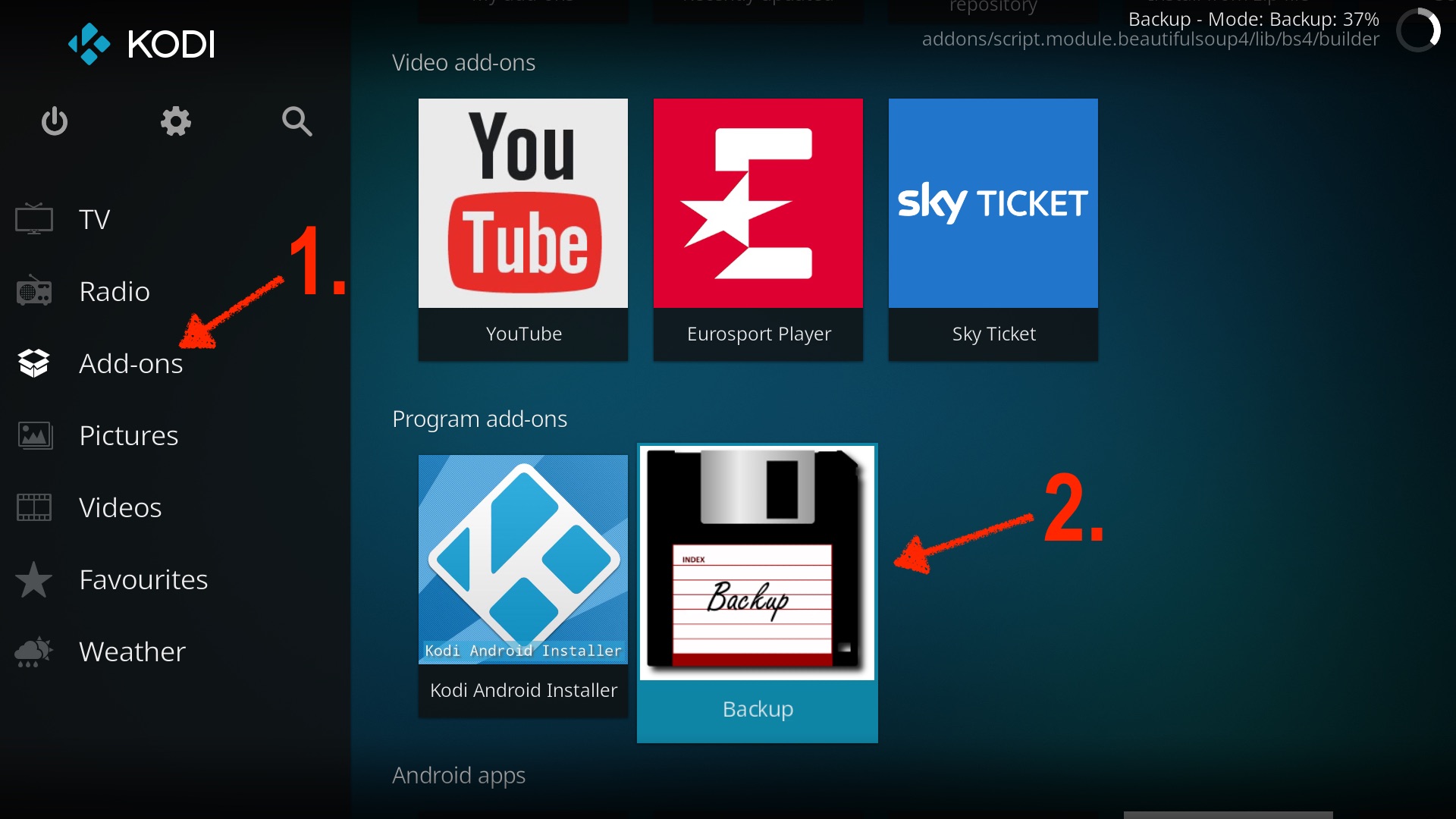 - Im Kodi “Add-on”-Hauptmenü unter “Program add-ons” auf das “Backup”-Icon klicken