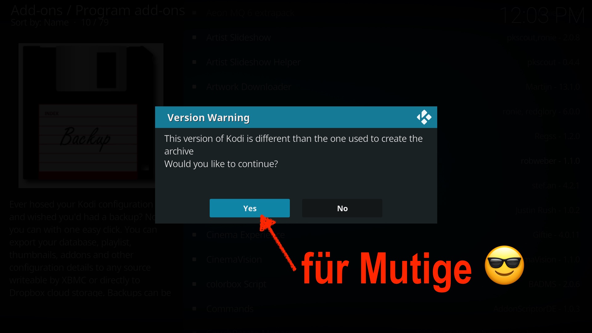 - Falls Ihr die Sicherung unter nun eine anderen Kodi-Version angelegt habt, erhaltet Ihr eine Fehlermeldung. Wir empfehlen, immer die gleiche Kodi Version zu verwenden, mit der auch die Sicherung angelegt wurde