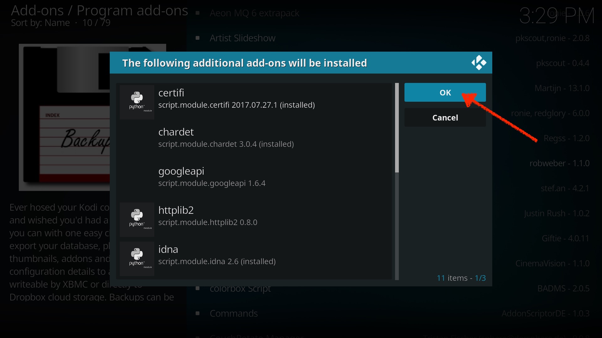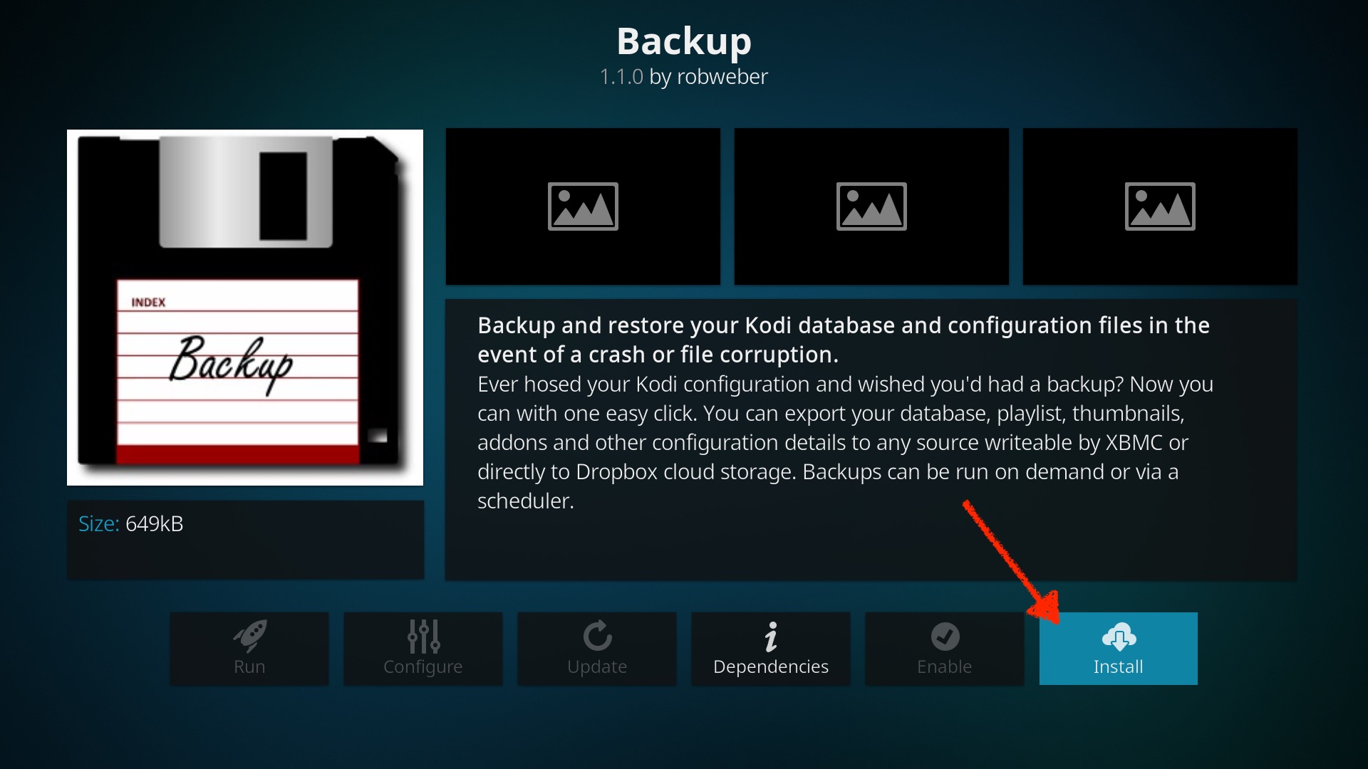 - die gleiche oder eine höhere Version des Kodi-Backup-Addons muss installiert sein (siehe oben)