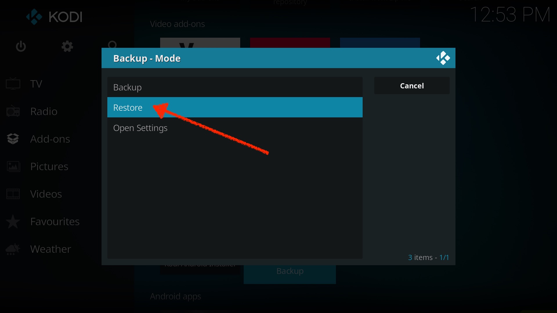 Genauso wie Ihr ein Backup angelegt habt, könnt Ihr ein Backup auch wieder auf dem gleichen oder einem anderen Gerät einspielen (Restore). Falls Ihr das Backup auf einem anderen Gerät installieren wollt, stellt sicher dass das Backup-Addon wie oben beschrieben in Kodi installiert ist. Anschließend geht einfach wie folgt vor: