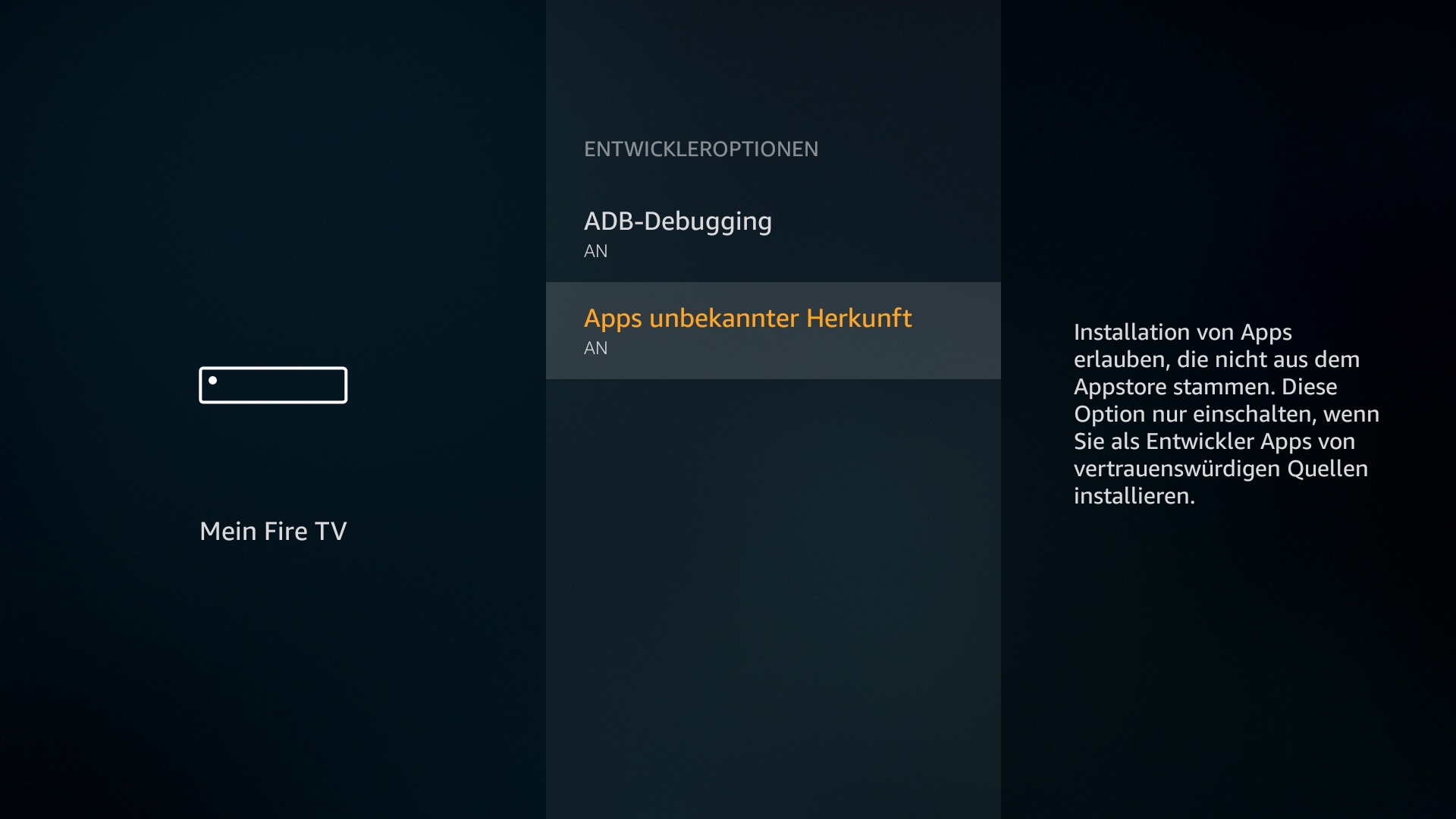 “Installieren von Apps unbekannter Herkunft” auf dem Fire TV aktivieren (falls nicht schon geschehen)