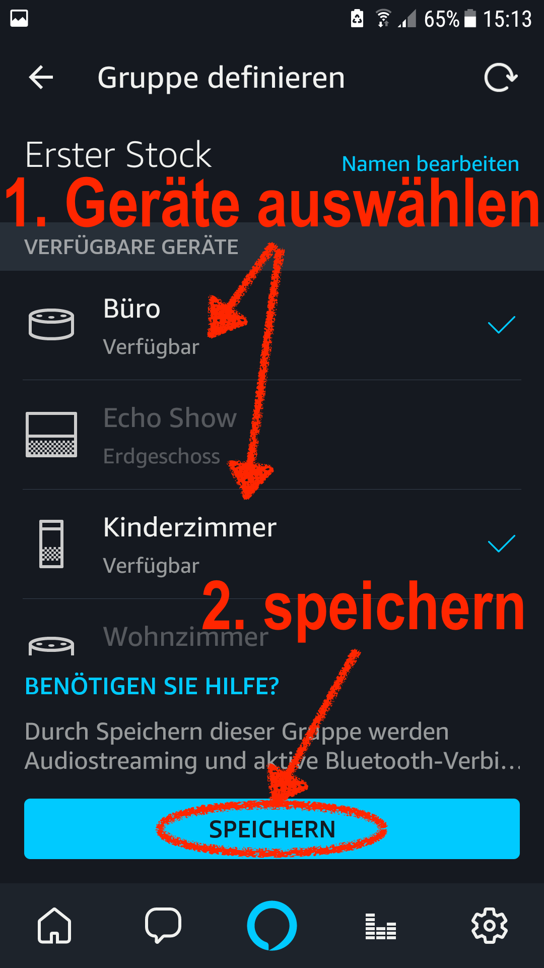 - wählt darunter die Echo Geräte aus, die in der Multiroom-Gruppe enthalten sein sollen, dies können auch mehr als 2 sein.