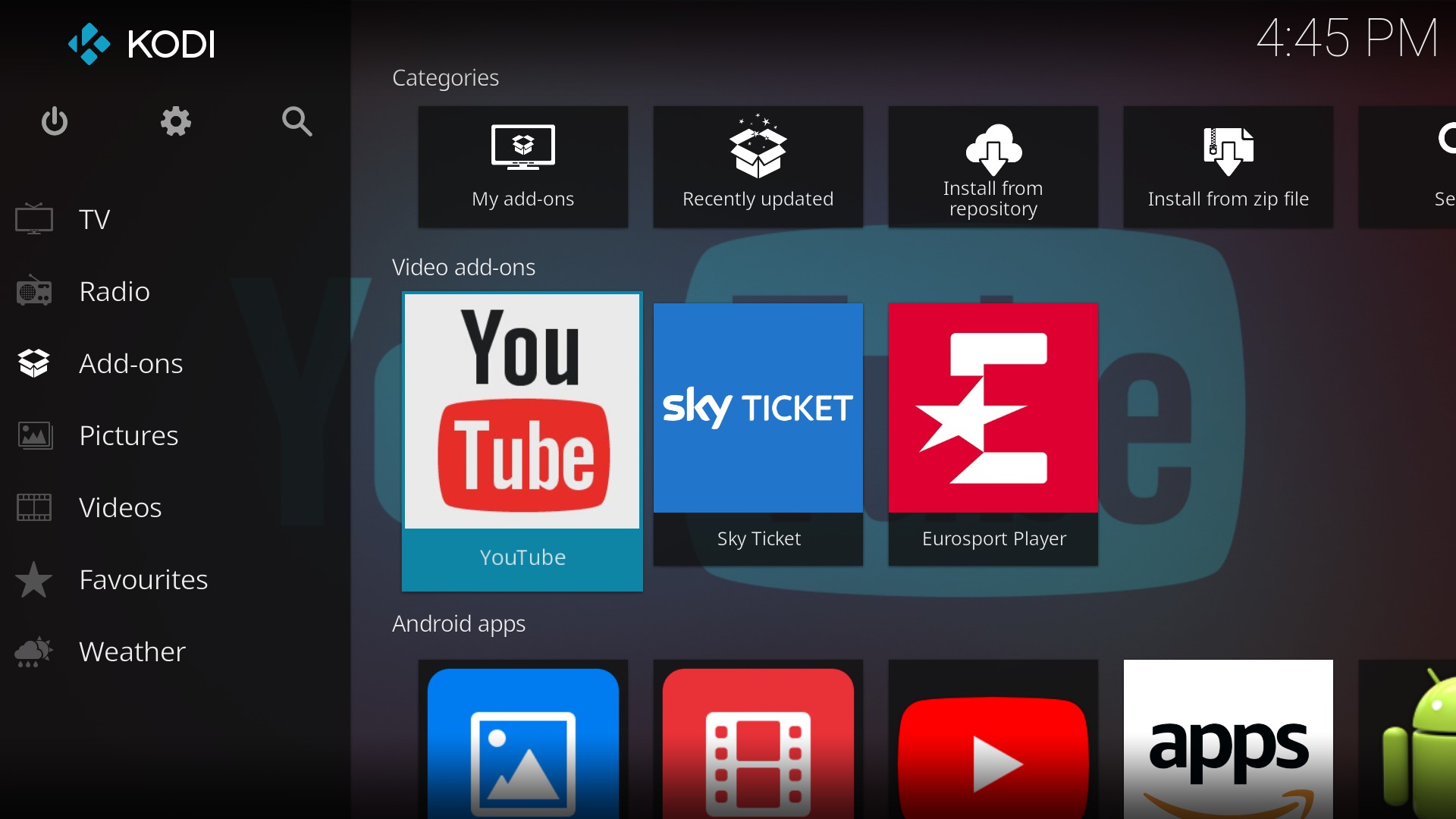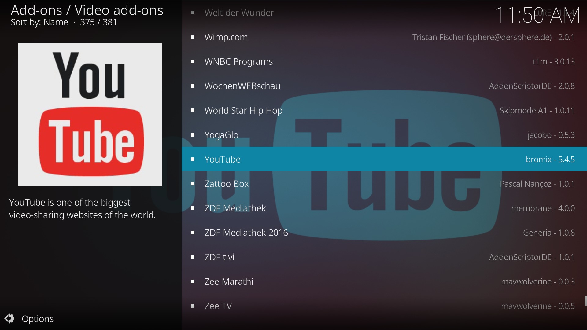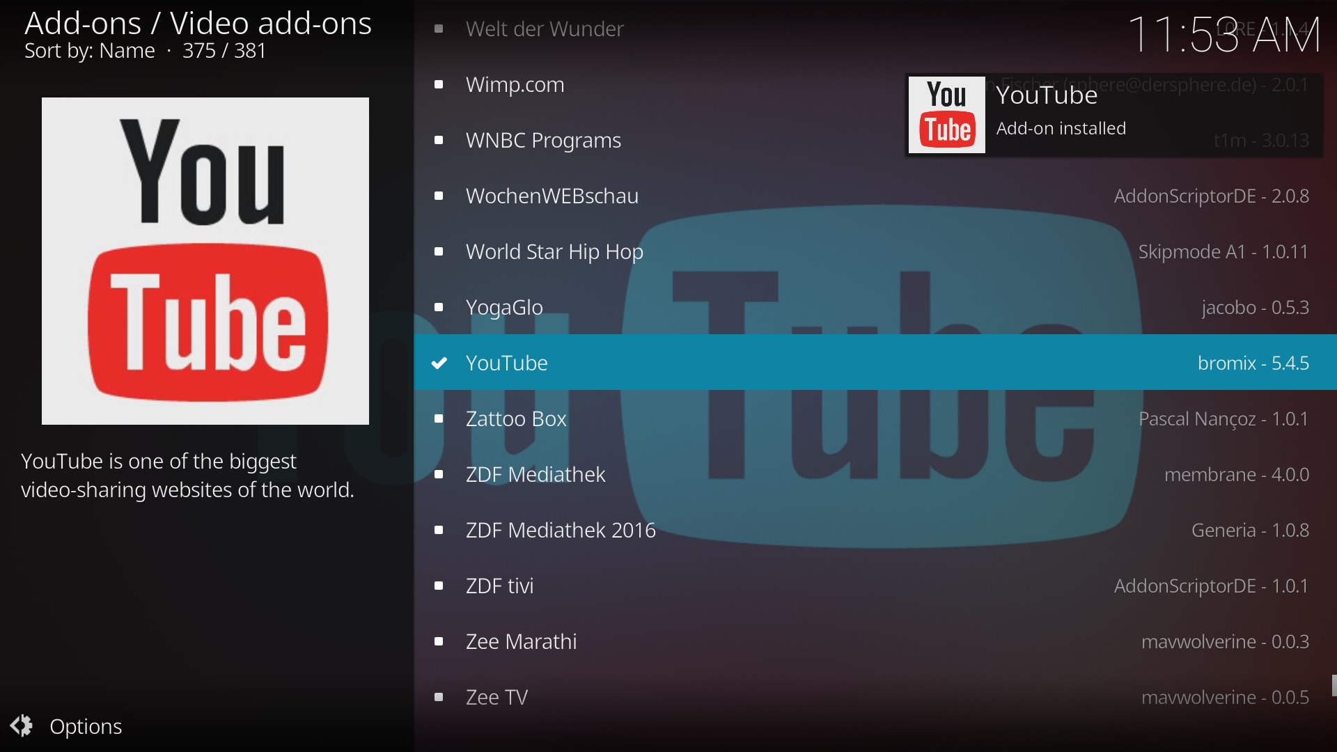 - Im Add-ons Menü erscheint nun der neue YouTube-Eintrag