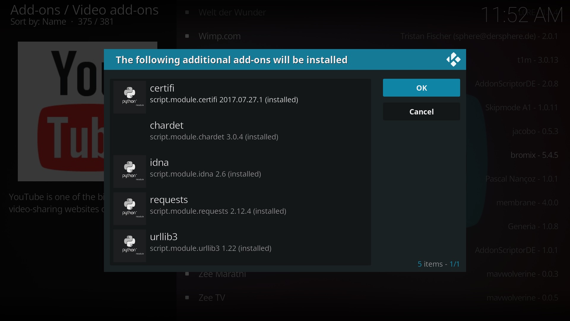 - Bestätigt die Installation der für das YouTube Add on benötigten zusätzlichen Module
