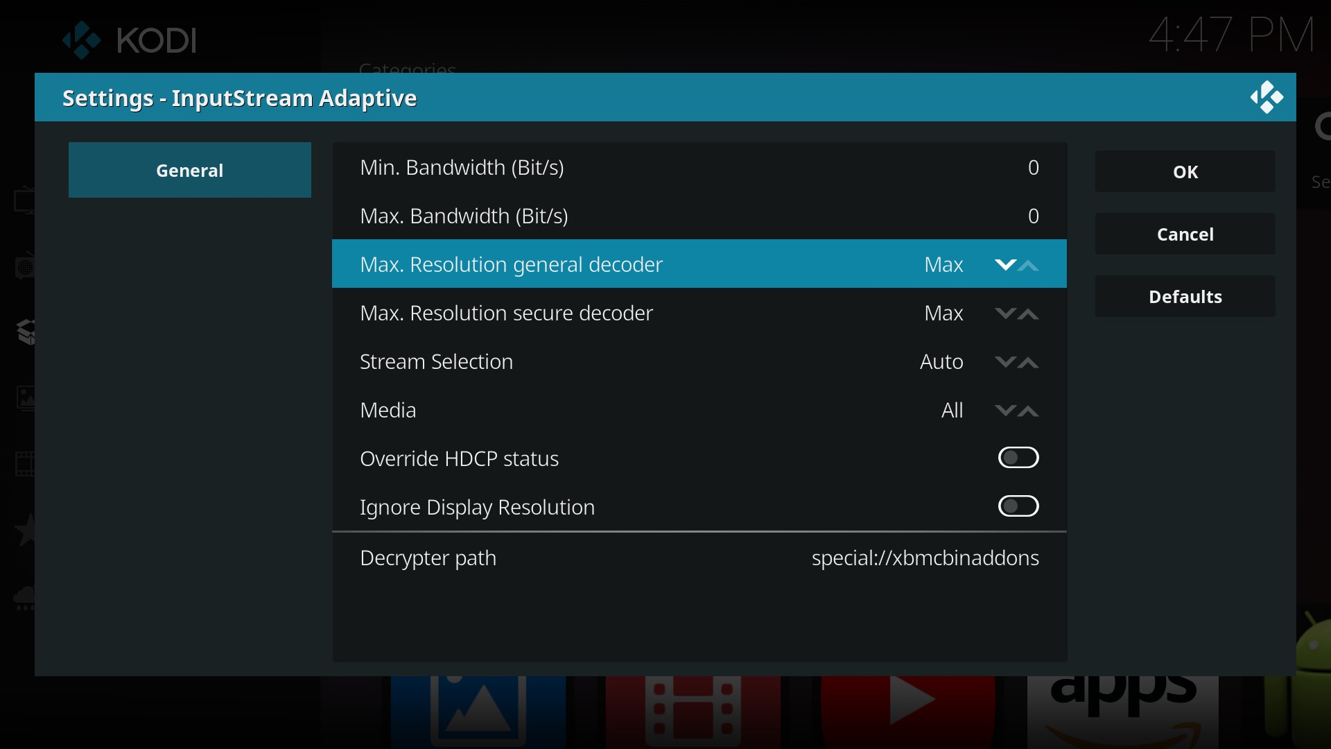 - In den Input Stream-Adaptive Einstellungen stellt Ihr sicher, dass Ihr bei Max. Resolution general decoder & secure decoder entweder auf Max eingestellt habt, oder auf 1080p