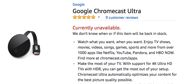 Wie von uns vermutet befürchtet ist das ganze eskaliert. Amazon hat zwar die Google Chromecasts auf amazon.com angelegt, bestellen oder gar einen Preis erfahren kann man jedoch nach über 2 Wochen immer noch nicht. Die zum gleichen Zeitpunkt angelegten Apple TVs kann man jedoch schon bestellen (aktuell sind sie jedoch vergriffen). Warum schafft es der Internet-Riese Amazon nicht, innerhalb von 2 Wochen auch nur einen Google Chromecast auf Lager zu legen?