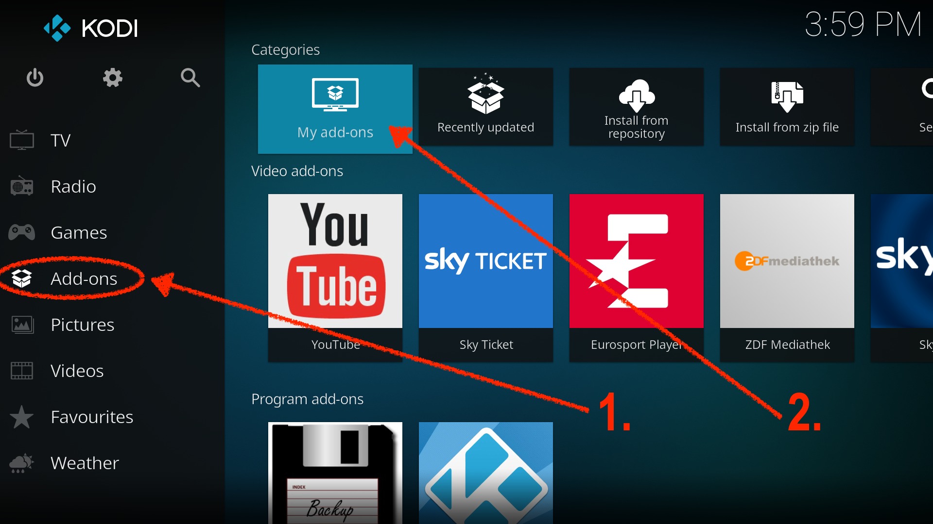 - Kodi starten und links im Hauptmenü auf Add-ons und dann rechts auf My add-ons klicken