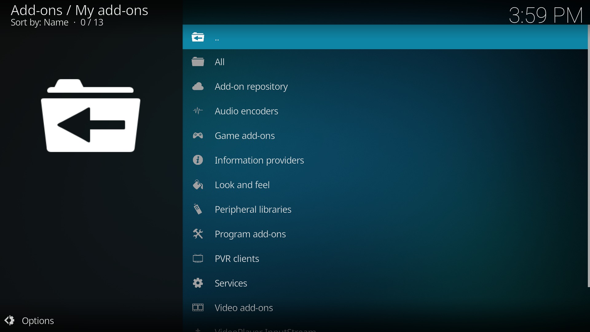 - so lange ganz oben auf “..” klicken, bis man im Hauptmenü von Add-ons ist