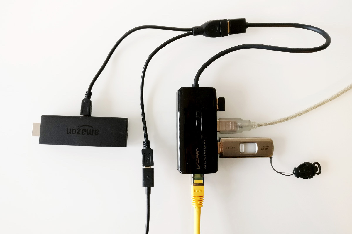 - Der Fire TV Stick 2 kann via OTG-Adapter an den USB-LAN-Adapter inkl. USB-Hub angeschlossen werden. Damit hat man sowohl Netzwerk-Anschluss als auch Zugriff auf USB-Geräte.