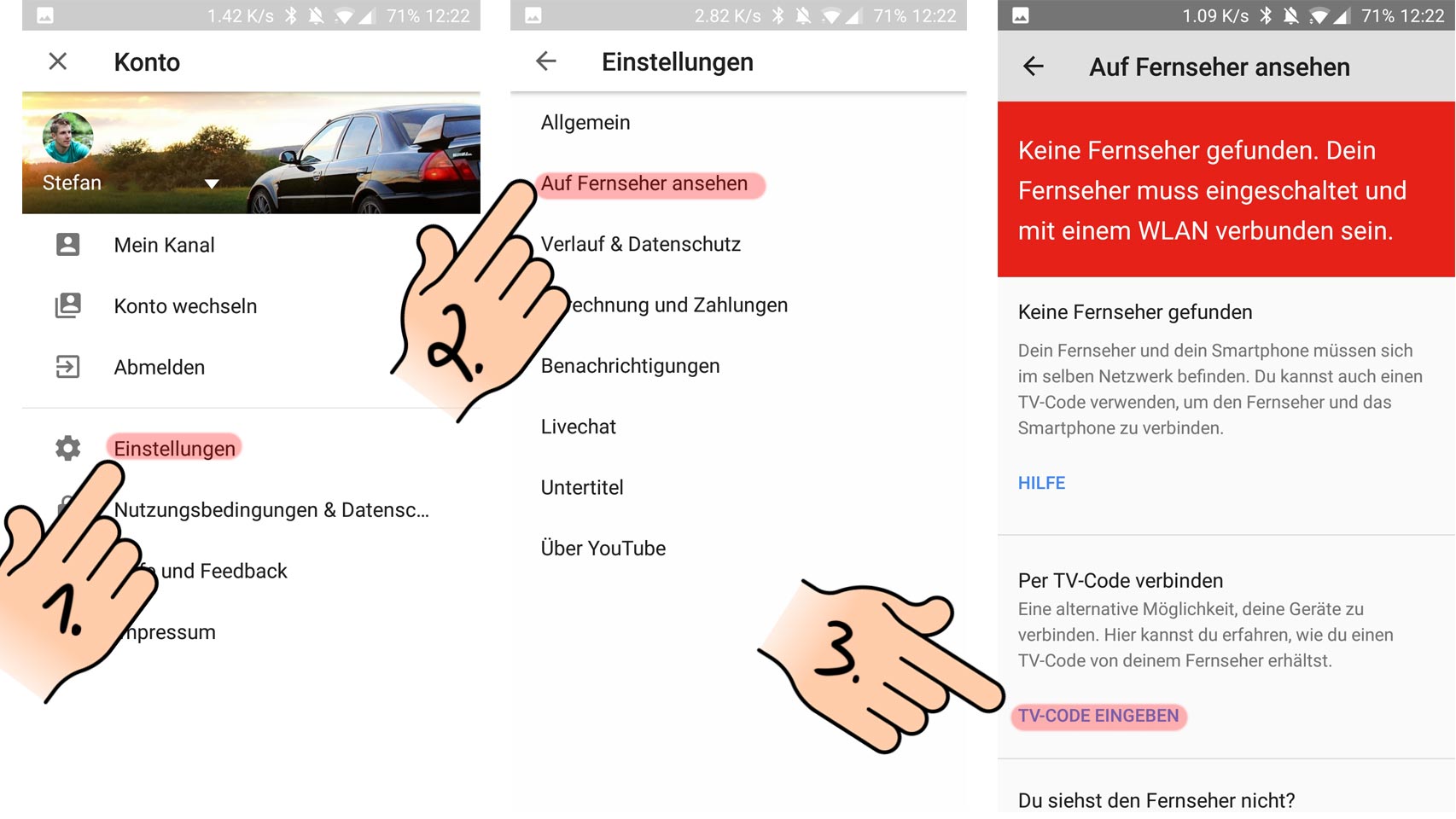 - 7. In den YouTube Einstellungen auf dem Smarthone “Auf Fernseher ansehen” auswählen